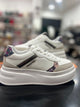 Sneakers Gattinoni Roma in pelle nera con suola alta bianca, eleganti e versatili. Il design è arricchito da un’incisione laterale con motivo firmato Gattinoni e da un raffinato accessorio decorativo oro vicino ai lacci, per un tocco distintivo e femminile.